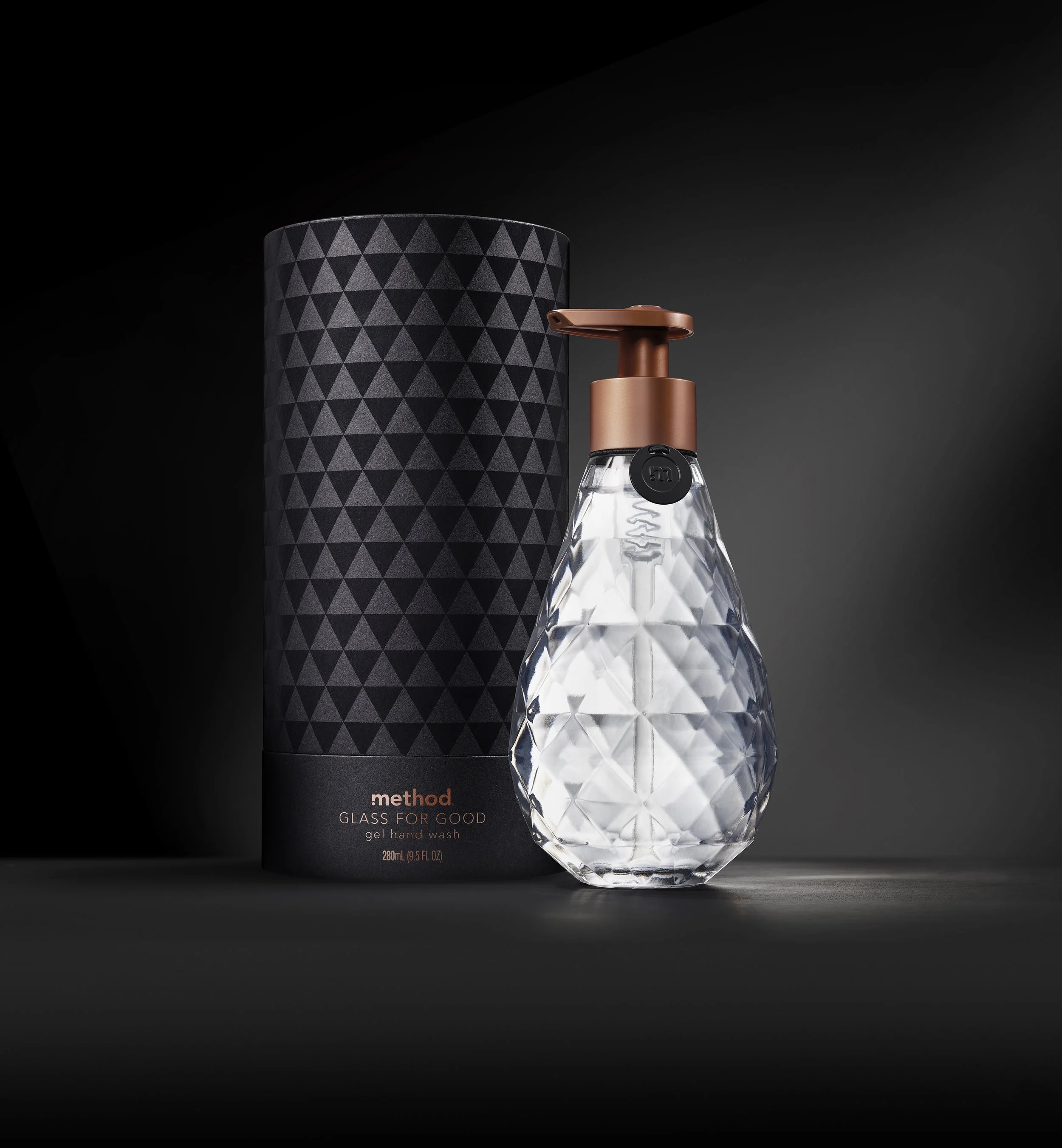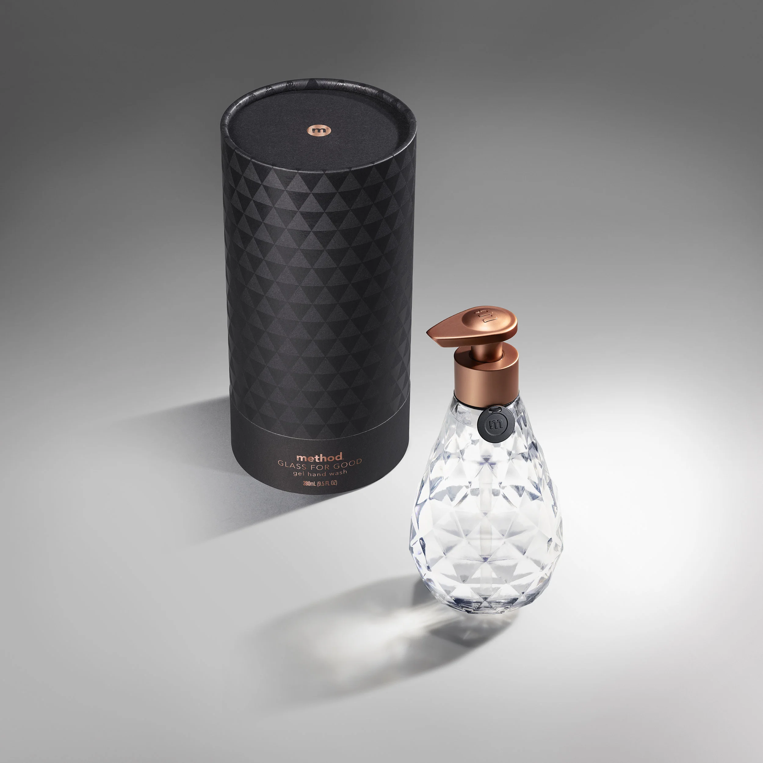 This is method’s first glass bottle ever produced. I wanted to focus on showcasing the glass bottle through the use of light. The light hitting the facets of the glass creates beautiful light reflections, shapes, and shadows. Because this was a more elevated moment of the method brand, as opposed to the usual colorful rainbows, I focused on simple black, whites and just a hint of violet color to reflect the fragrance, violet noir.